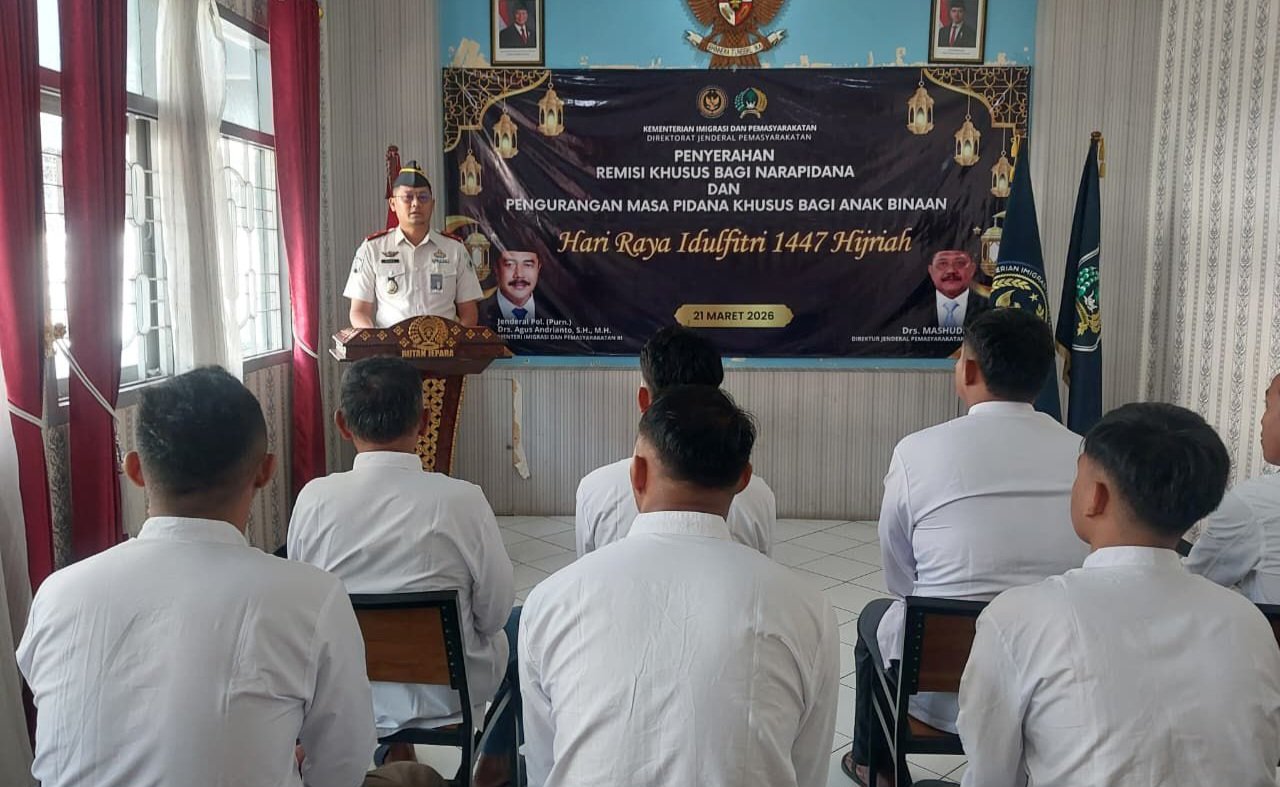 Penyerahan Surat Keputusan (SK) remisi dilakukan secara simbolis pada Sabtu (21/3/2026), yang diserahkan langsung oleh Kepala Rutan Kelas IIB Jepara, Renza Maisetyo, usai pelaksanaan sholat Idulfitri di lingkungan Rutan Jepara.